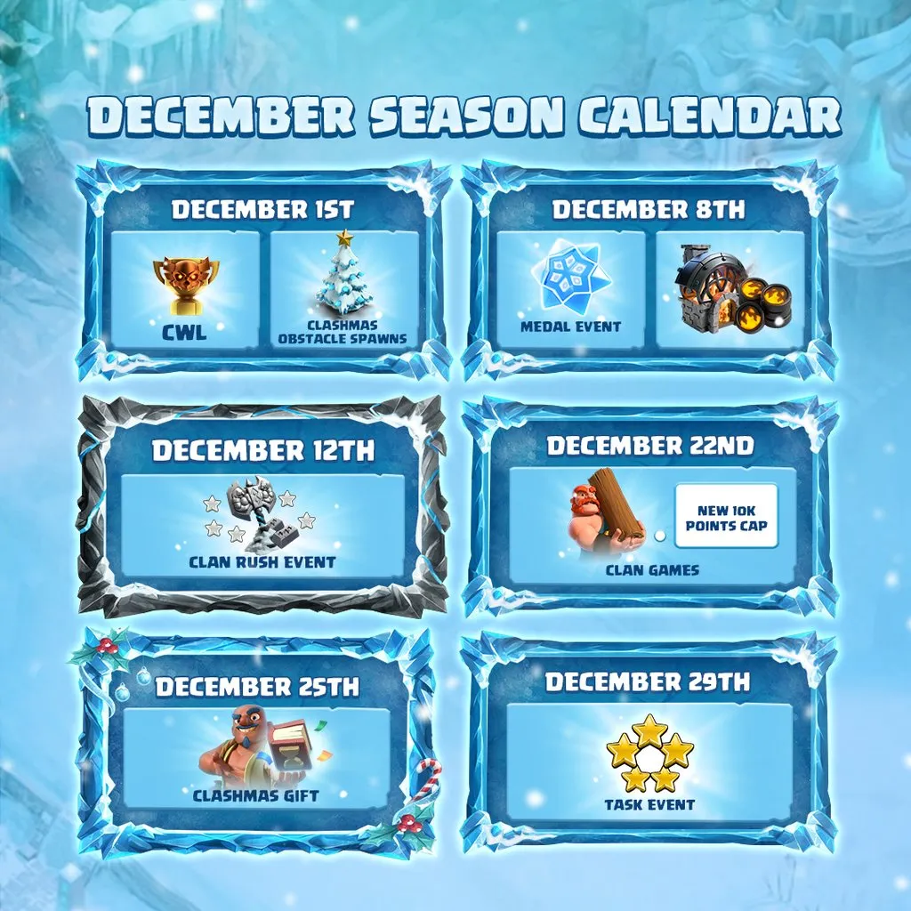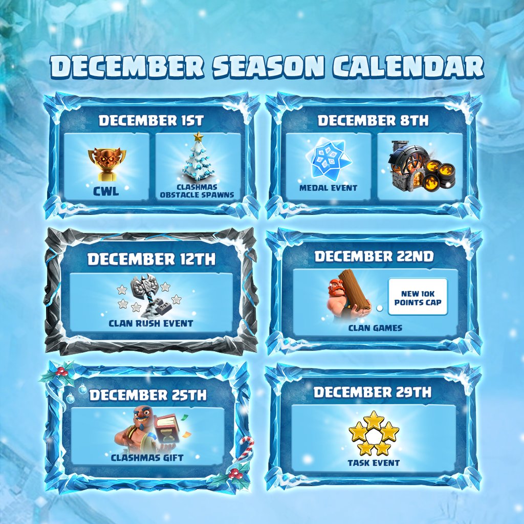 Giochi del clan (dal 22 al 28 dicembre): porta a termine gli incarichi scelti per guadagnare punti e vincere ricompense. Tutto nella norma, giusto? Beh, non proprio, perché in questa stagione c'è una novità interessante: il Forzuto, infatti, aumenterà i punti ottenibili da 4000 a ben 10.000, permettendo ai clan con meno membri attivi di sbloccare più facilmente tutti i premi! Tieni comunque a mente che serve sempre guadagnare 4000 punti per ricevere la ricompensa extra alla fine dei giochi.