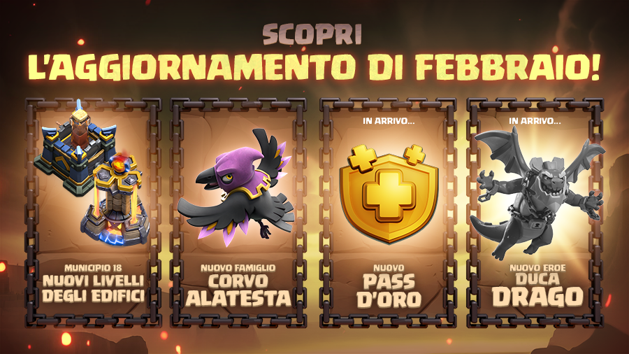 Dal 22 al 28 marzo, si terranno i giochi del clan in un'edizione a tema draghi, in cui gli incarichi dedicati a queste creature appariranno più di frequente e ti faranno guadagnare più punti del solito. Inoltre, potrai ottenere ancora più punti usando il duca drago negli attacchi e fare così incetta di ricompense nei giochi del clan!